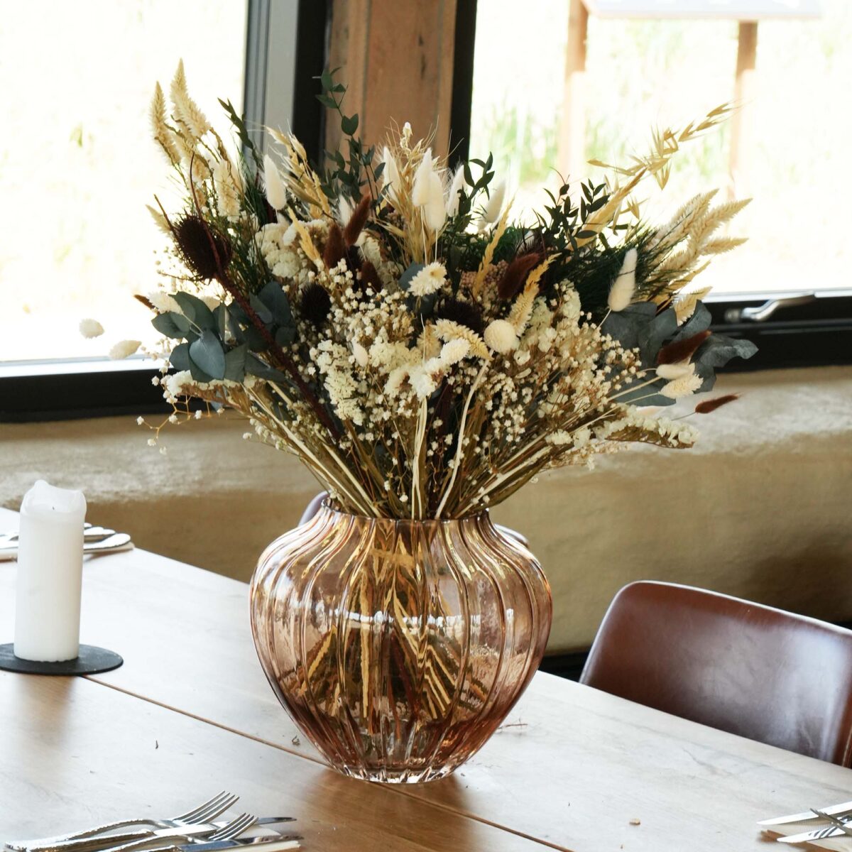 Tørrede blomster: Disse er nøje udvalgte for deres evne til at bevare form og farve efter tørringsprocessen. Ved at fjerne fugtigheden opretholder disse blomster deres skønhed i lang tid uden behov for vand.